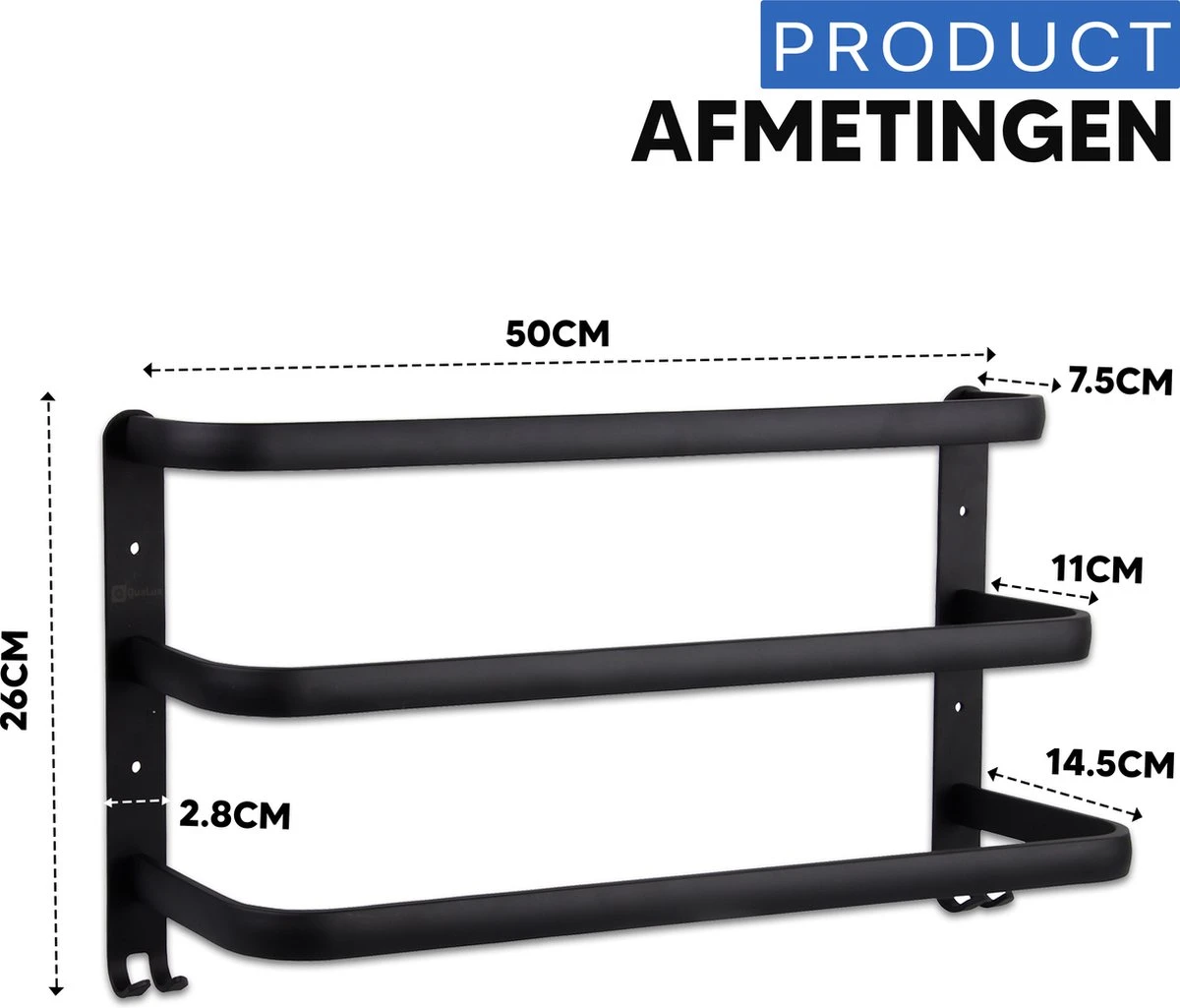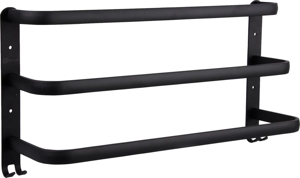 Het luxe handdoekrek van Qualux® is ultiem veelzijdig en superhandig. Je monteert het stijlvolle zwarte rek met de bijgeleverde montagematerialen in een handomdraai op je muur, deur of kast en vervolgens hang je er alles aan wat je maar wilt – Bijvoorbeeld de bijgeleverde luxe handdoek! Dit luxe handdoekrek is werkelijk geschikt voor elke badkamer. Met zijn drie stangen om handdoeken op te hangen is dit rek zelfs geschikt voor gezinnen. Verrassend genoeg heeft het rek ondanks de royale ophangruimte een ruimtebesparend ontwerp, zodat jij niet veel ruimte zal moeten inleveren in jouw badkamer. Het rek is verkregen uit kwalitatief hoogwaardige materialen, zodat het rek niet zal gaan roesten en zo een zeer lange levensduur heeft. Geniet eindeloos lang van dit handige handdoekrek!