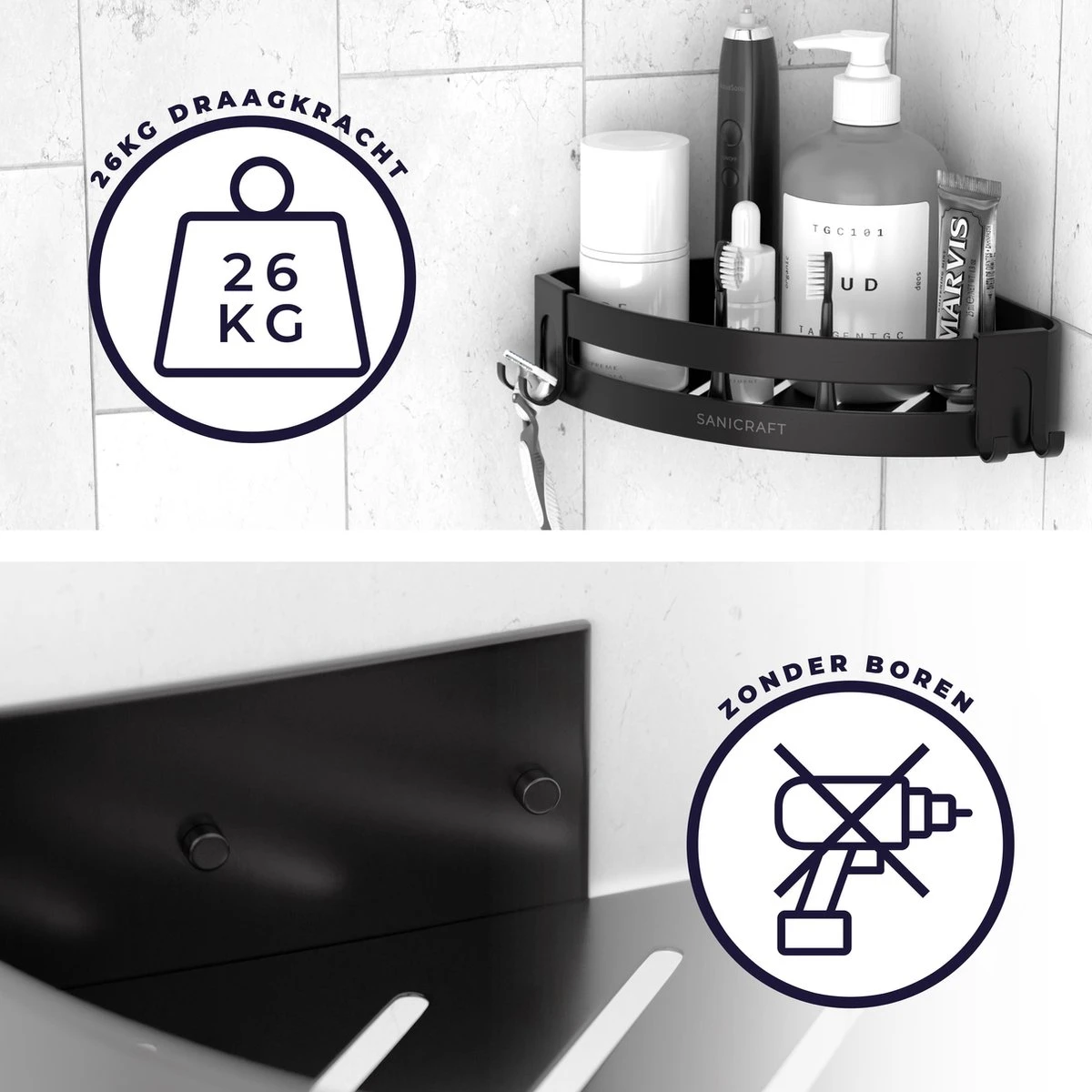 Met het 2-laagse doucherekje van Sanicraft® creëer je een opgeruimde en stijlvolle badkamer. Nooit meer omvallende flessen shampoo op de badkamervloer. Of scheermesjes die van de badrand afvallen. Voortaan heb je alles wat je nodig hebt binnen handbereik. En dat zonder te boren! Dit doucherekje komt met een supersterke lijm die geschikt is voor elk type muur. Zonder de muur te beschadigen. Bestel nu en geef je badkamer een modern uiterlijk!