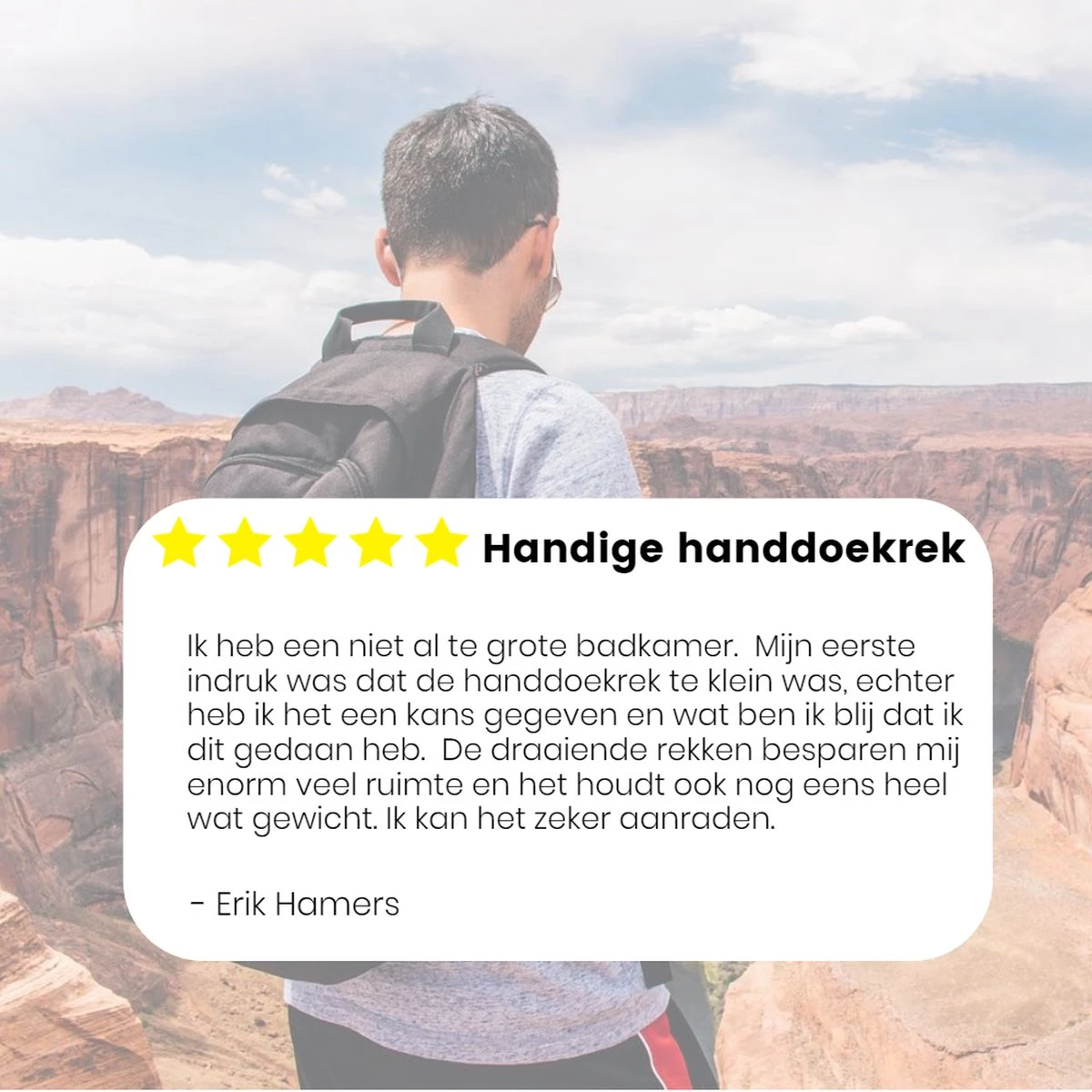 Zoals hierboven omschreven, kunnen de rekken gedraaid worden naar jouw keuze. Dit betekent dus ook dat je veel ruimte kunt besparen in de badkamer! De meeste handdoekrekken hebben rekken die vastzitten op één positie. Het Tolussa handdoekrek daarentegen is flexibel en past zich aan op jouw situatie!